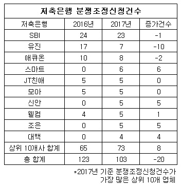 1일 저축은행중앙회에 따르면 지난해 금융감독원에 접수된 저축은행 분쟁조정 신청 건수(반복제외,건수 많은 상위 10개 업체 기준)는 전년 동기(123건)대비 다 20건 감소한 103건으로 집계됐다.