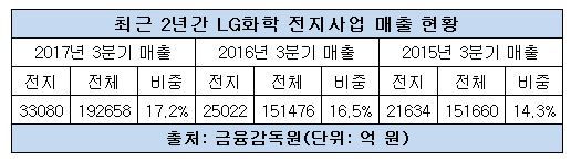 이같은 투자에 힘입에 LG화학 전지사업의 매출 비중은 매년 증가하고 있다. 지난해 3분기 기준 3조3080억 원의 매출을 기록, 전체 매출의 17.2%를 차지했다. 2015년 대비 2.9%포인트 상승한 수치다.