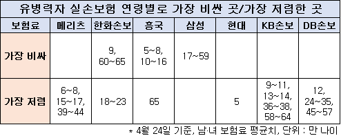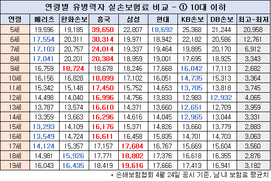 5세는 현대해상이, 6~8세는 메리츠화재가 가장 저렴했다. 9~11세 KB손보, 12세 DB손보, 13~14세 KB손보, 15~17세 메리츠화재, 18~23세 한화손보, 24~35세 DB손보, 36~38세 KB손보, 39~44세 메리츠화재, 45~57세 DB손보, 58~64세 KB손보, 65세 흥국화재의 보험료가 최저가로 집계됐다.
