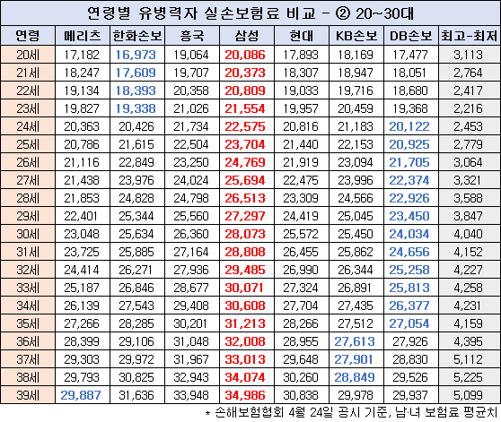 23세는 보험사별 보험료 차이가 가장 적었다. 가장 비싼 삼성화재는 2만1554원이고, 가장 저렴한 한화손보는 1만9338원으로 2216원 차이 났다.