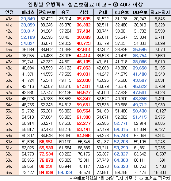 17세부터 59세까지는 삼성화재의 보험료가 최대 1만127원 비쌌다. 9세, 그리고 60세부터 65세까지는 한화손보의 보험료가 최고가로 집계됐다.