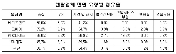 렌탈계약 및 해지 관련 불만이 근소한 차로 뒤를 이었다. 약정 기간내 제품 고장 등의 문제가 발생할 경우 무상교체, 위약금 등의 문제로 갈등이 빈번했다.