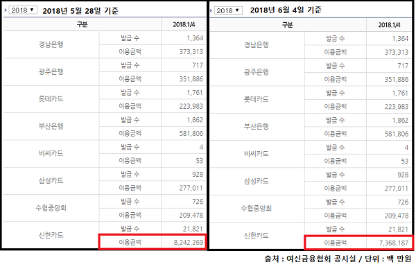이에 대해 신한카드 관계자는 “이번 공시와 관련된 통계 자료를 담당하던 현업 부서의 신입직원이 실수한 것 같다”면서 “여신금융협회 공시에 오류났다는 사실을 알게 된 즉시 수정하도록 조치했다”고 말했다.