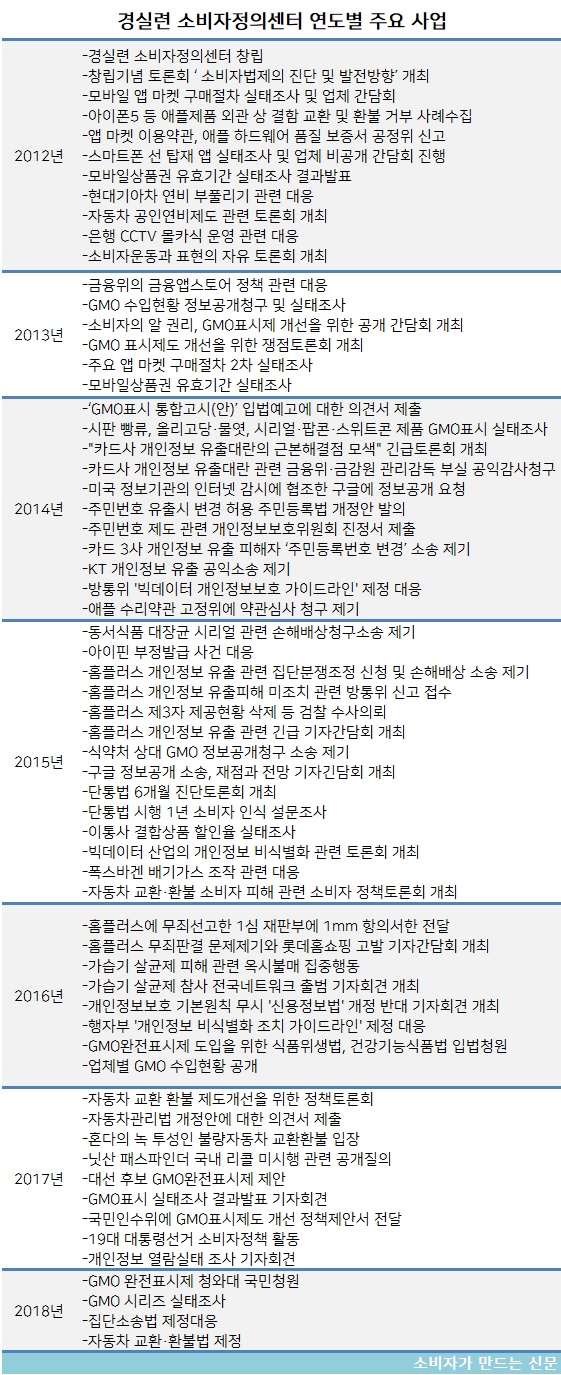 소비자정의센터는 창립 후 불합리한 소비구조 개선에 힘쓰고 굵직한 소비자피해 이슈에 적극 대응해 왔다.