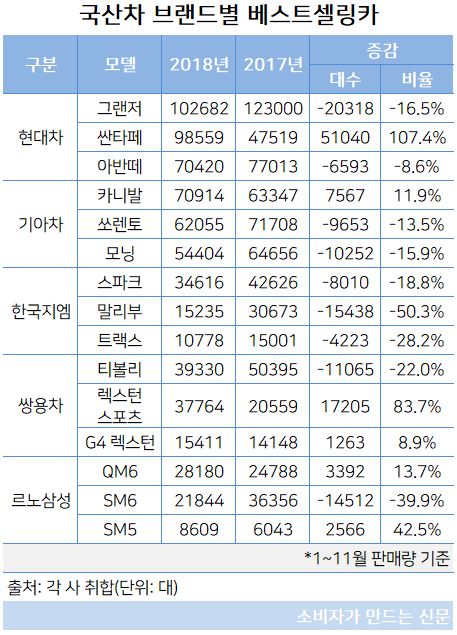 또한 올해 신형 모델이 출시된 현대차 싼타페와 쌍용차 렉스턴 스포츠의 경우 판매량이 각각 107%와 84% 증가하며 브랜드 내 판매 순위 2위로 반등했다. 지난해 말부터 ‘판매 역주행’ 돌풍을 일으키고 있는 르노삼성 SM5는 탄탄한 기본기와 높은 가성비를 앞세워 42.5% 증가한 8609대가 팔리며 제2의 전성기를 맞이하고 있다.