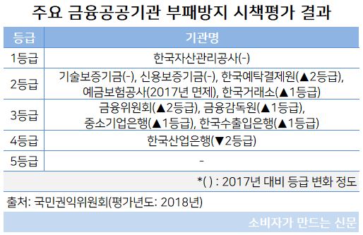 또한 산업은행은 지난달 말 국민권익위원회(이하 권익위)가 발표한 2018년 부패방지 시책평가에서 4등급을 받았다. 산업은행의 평가 등급은 주요 금융 공공기관 중에서는 최하 등급에 속한다.