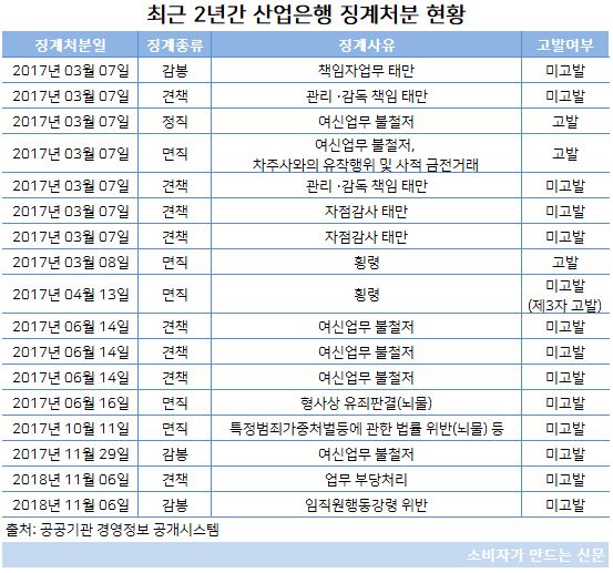 산업은행은 지난 2017년과 작년에 진행한 자체 내부감사를 통해 총 17건에 달하는 징계 처분을 단행했다. 이는 같은 기간 한국수출입은행(7건), 한국주택금융공사(5건), 기술보증기금(6건), 예탁결제원(5건) 등 주요 금융공공기간의 징계 건수에 비해 많은 숫자다.
