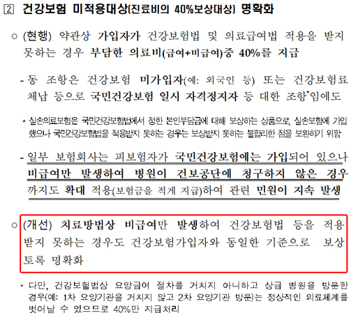 당시 보험사의 ‘국민건강보험법의 적용을 받지 못하는 경우’는 외국인 등 건강보험 미가입자 또는 건강보험료 체납 등으로 일시 자격이 정지된 자에 대한 조항임에도 불구하고 비급여까지 확대 적용 해석해 보험금을 적게 지급하는 문제가 있었다. 이 때문에 금감원은 치료방법상 비급여가 발생해 건강보험법 등을 적용 받지 못하는 경우도 건강보험가입자와 동일한 기준으로 보상하도록 명확화했다.
