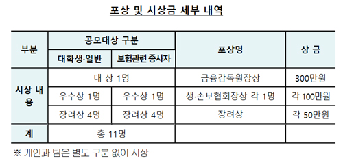 현재 판매하고 있는 보험상품 약관을 이해하기 쉽고 간결하게 만드는 ‘알기 쉬운 보험 약관 직접 만들기’, ‘보험약관 개선 아이디어 만들기’, ‘어려운 보험용어 쉽게 만들기’ 등 3개 분야로 구분해 공모를 실시한다.