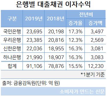 대출채권 이자수익 증가폭은 원화대출금 증가율이 가장 높았던 국민은행(17.3%)이 제일 컸으며 신한은행과 하나은행이 각각 16.3%로 뒤를 이었다. 반면 가장 낮은 원화대출금 증가율과 이자율을 보였던 우리은행은 대출채권 이자 증가율이 12.3%에 머물렀다.