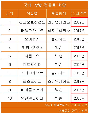 20일 게임트릭스 PC방 점유율 집계에 따르면 지난달 말 기준 상위 10개 중 6개의 게임이 출시된지 10년이 넘은 것으로 나타났다.