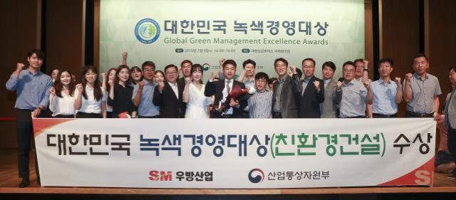 SM우방산업(대표 조유선)은 지난 9일 대한상공회의소 국제회의장에서 열린 '2019년 대한민국 녹색경영대상’시상식에서 ‘친환경건설 부문 산업통상자원부장관 표창’을 받았다고 밝혔다.