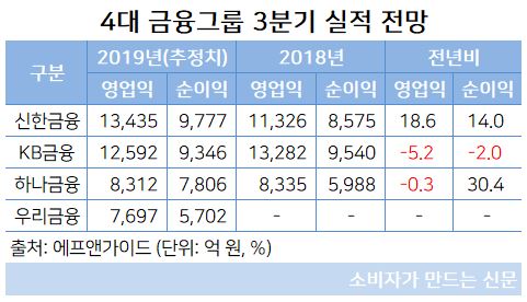신한금융그룹(회장 조용병)이 지난 상반기에 이어 3분기에도 4대 금융그룹 중 순이익 1위 자리를 지킬 것으로 전망된다.