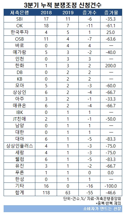 OSB저축은행은 지난해 보다 7건(63%) 줄어든 4건에 그쳤다. 대아저축은행과 웰컴저축은행도 나란히 5건씩 분쟁이 감소한 1건만 발생했다.