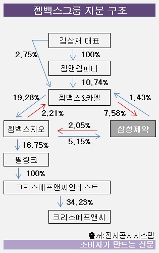 우선 ‘김상재 대표→젬앤컴퍼니→젬백스&카엘'로 지배구조가 이어져 있다. 그리고 젬백스&카엘은 삼성제약, 젬백스지오와 순환출자로 엮여 있다. 그리고 '젬백스지오→필링크(대표 김상재·서영운)→크리스에프앤씨인베스트(대표 서영운)→크리스에프앤씨(대표 우진석)’가 연결되는 구조다.