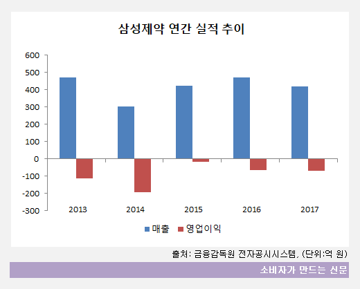 특히 삼성제약은 지난 6년 간 매년 영업손실을 기록해 만성적자 기업으로 꼽힌다.