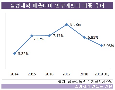 삼성제약의 매출대비 연구개발비 비중은 2019년 3분기말 기준 5.03%에 그쳤다. 전년 동기 6.91%에 비해 2%포인트 가까이 낮아졌다. 상위 제약사들이 매출의 두 자릿수 비율을 연구에 쏟아붓고 있는 것과 대조된다.