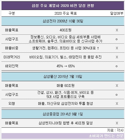 삼성전자와 함께 2020년 매출 목표를 밝힌 삼성물산과 삼성중공업 역시 비전 달성에는 실패했다.