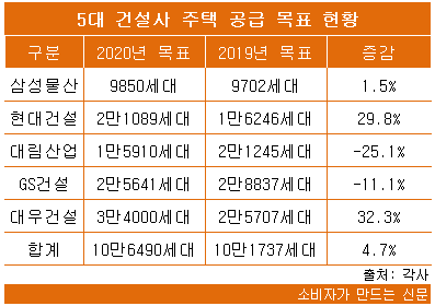 17일 건설업계에 따르면 삼성물산과 현대건설, 대림산업, GS건설, 대우건설 등 국내 5대 건설사의 올해 목표 주택 공급량은 총 10만6490세대로 전년(10만1737세대) 대비 4.7% 늘었다. 계속된 규제로 국내 분양 시장이 얼어붙은 상황에서 공급 목표 확대는 이례적이라는 평가다.