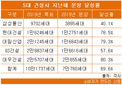 이처럼 건설사들이 설정한 목표는 대체적으로 확대된 상황이지만 달성 여부는 미지수다. 지난해에도 5대 건설사 중 목표를 달성한 곳이 한 곳도 없을 만큼 부진했기 때문이다. 5대 건설사는 지난해 총 7만760세대를 공급해 69.6%의 달성률을 기록했다.