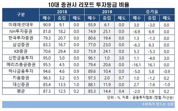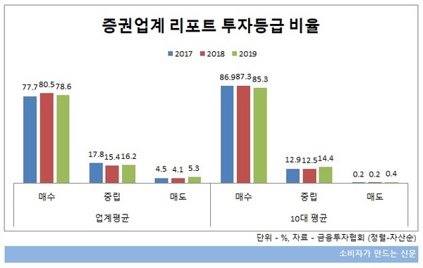 10대 증권사의 매도 비중도 지난해와 큰 차이없는 0.4%로 집계됐다. 신한금융투자의 매도 의견 비중이 3%로 가장 높았고 키움증권이 0.7%로 집계됐다.
