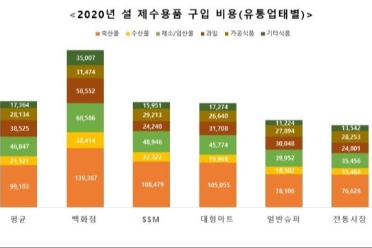 전통시장이 평균 19만4148원으로 가장 저렴했고 일반슈퍼마켓(20만5727원) > 대형마트(24만6359원) > SSM(24만9150원) > 백화점(37만1399원) 순으로 나타났다.