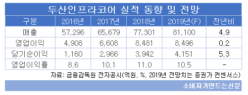 두산인프라코어의 매출은 2016년 5조7296억 원, 2017년 6조5679억 원, 2018년 7조7301억 원으로 꾸준히 증가세를 보여왔다. 영업이익이 2016년에는 4908억 원 수준이었으나 2018년부터 8000억 원대로 올라섰다.