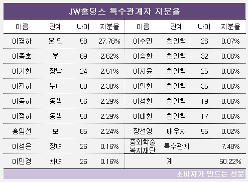 현재 그룹 지배구조의 정점에 있는 이경하 회장은 JW홀딩스 지분 27.78%를 지닌 최대주주다. 이종호 명예회장이 2.62%, 이 회장의 형제인 이진하(60)·동하(56)·정하(50)씨 등이 각각 2.3% 안팎의 홀딩스 지분을 보유했다.