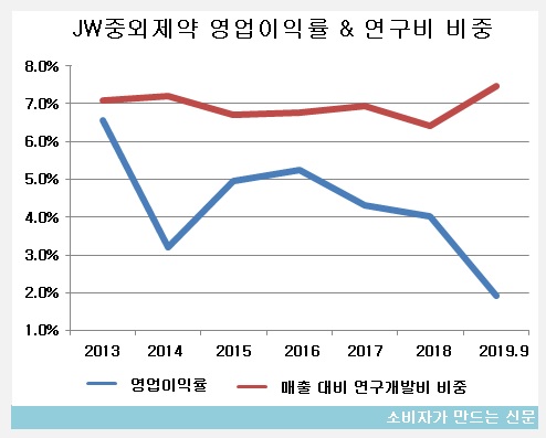 JW중외제약의 수익성 고민은 지난해만의 일이 아니다. 2018년 매출은 5년 전인 2013년에 비해 3942억 원에서 5372억 원으로 36.3% 증가했지만, 같은 기간 영업이익은 259억 원에서 216억 원으로 16.7% 감소했다. 이 기간 영업이익률도 6.6%에서 4%로 낮아졌다.