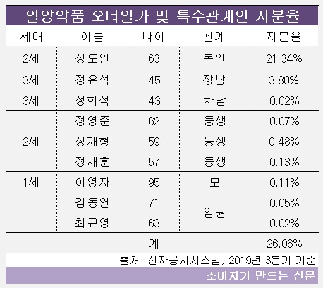 2대 주주는 장남 정유석 부사장(45)으로 지분 3.80%를 보유했다. 정도언 회장의 동생 정재형(59) 씨가 0.48%, 어머니 이영자(95) 씨가 0.11%, 둘째 아들 정희석(43) 일양바이오팜 대표가 0.02% 등을 보유했다.