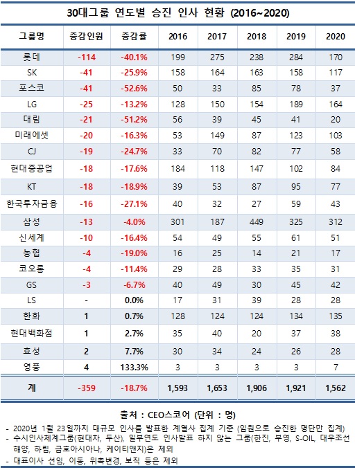 2020년 임원 승진자는 1562명으로 2016년부터 2020년까지 5년간 정기인사 규모 중 가장 적은 수준이다. 직위별로는 부사장 승진자가 30.7%나 줄었고 상무이사도 20.1% 감소했다.