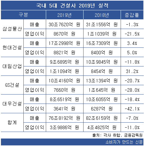 삼성물산과 현대건설, 대림산업, GS건설, 대우건설 등 시공능력평가 기준 5대 건설사의 지난해 영업이익은 총 3조9886억 원으로 전년 4조4825억 원보다 11% 감소했다. 매출도 76조8192억 원으로 전년도 82조6159억 원에 비해 7% 줄었다.