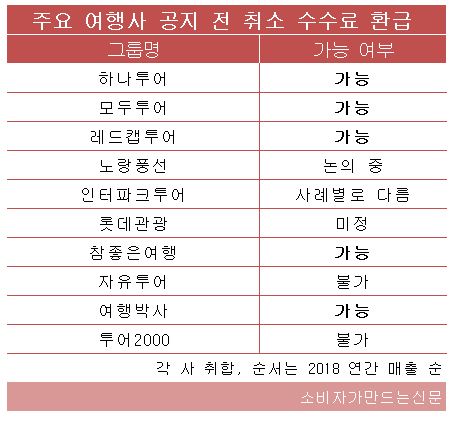 상위 10개 업체(상장사 매출기준) 기준 확인 결과 발표 전 취소한 소비자들에게도 이를 소급 적용하고 있는 곳은 하나투어, 모두투어, 참좋은여행, 레드캡투어, 여행박사 5곳 뿐이었다.