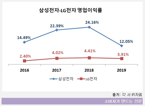 이에 따라 삼성전자는 영업이익률이 24.16%에서 12.05%로 반토막이 났고, LG전자는 4.41%에서 3.91%로 소폭 하락했다.