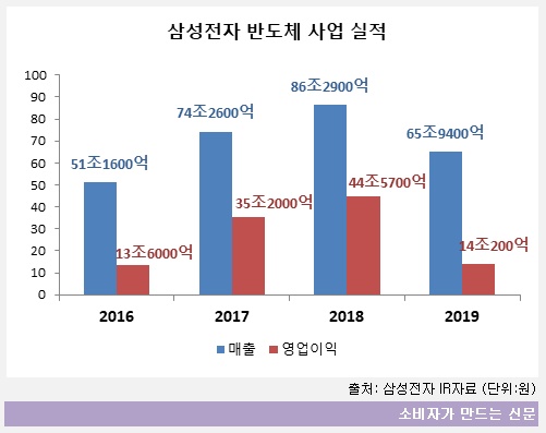 2019년 반도체 부문 영업이익은 14조200억원으로 2018년 44조5700억원에 비해 68.54% 감소했다. 2018년 반도체 초호황기가 끝나며 시장이 침체, 지난해 7월까지 메모리반도체 D램 가격이 큰 폭으로 하락한 데 따른 것이다.