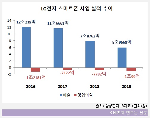 LG전자의 스마트폰 사업은 매출 5조9668억원, 영업이익 -1조99억원을 기록해 각각 24.24%, 30.68%씩 감소했다. H&A사업부 영업이익 1조9962억 원을 MC사업부가 1조99억 원 만큼 깎아 먹은 셈이다.