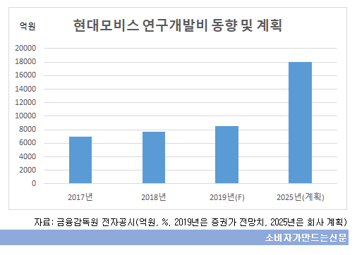현대모비스는 EV·자율주행차 같은 미래차 신기술 연구개발에 더 투자할 방침이다. 2025년까지 연구개발비중을 매출의 10%(1조8000억 원 규모)까지 높일 방침이다. 현재 600명 수준인 자율주행 개발 인력을 2021년까지 1000명 이상으로 두 배 가까이 늘리고, 소프트웨어 설계 인력은 2025년까지 현재의 4배인 4000명까지 확대할 계획이다.
