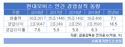 현대모비스는 지난해 매출 38조488억 원, 영업이익 2조3593억 원을 기록했다. 전년보다 매출은 8.2%, 영업이익은 16.5% 증가했다. 영업이익률도 전년 5.8%에서 지난해 6.3%로 0.5%포인트 상승했다.