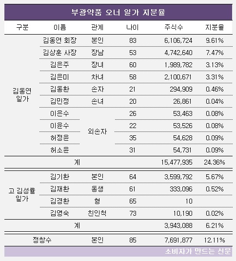 김성률 회장이 타계하면서 오너 일가로 묶여 있던 동서 정창수(85) 부광약품 부회장도 현재는 지분공시를 별도로 하고 있다. 정 부회장은 부광약품 지분 12.11%를 보유한 개인 최대주주다.