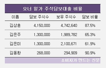 김동연 회장 일가는 2,3세 승계과정에서 보유 주식 상당부분을 담보로 잡힌 상태다. 김 사장의 주식담보대출 비중은 87.5%다. 김은주·은미 씨도 담보대출 비중이 60% 이상으로 높다.