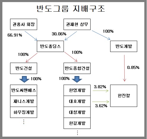 반도홀딩스는 권홍사 회장이 69.61%, 장남인 권재현 반도개발 상무가 30.06% 등 총 99.67%지분을 보유했다.