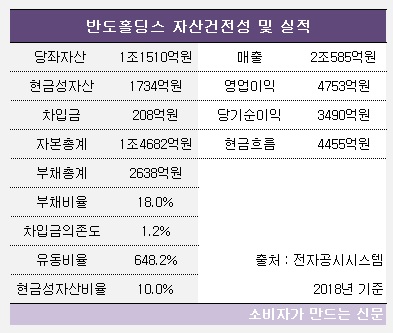 반도그룹의 재무구조는 우량하다. 반도홀딩스가 보유한 자산 가운데 현금화가 쉬운 당좌자산은 연결재무제표 기준으로 2018년말 1조1510억 원에 달한다. 이중 분양미수금이 6419억 원, 현금성자산은 1734억 원이다.