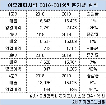금융감독원 전자공시시스템에 따르면 아모레퍼시픽은 지난해 2분기까지 역성장을 기록하다가 3분기부터는 성장세로 돌아섰다. 지난해 4분기에는 매출 1조5025억 원, 영업이익 625억 원으로 전년 동기 대비 8%, 281% 대폭 상승했다.