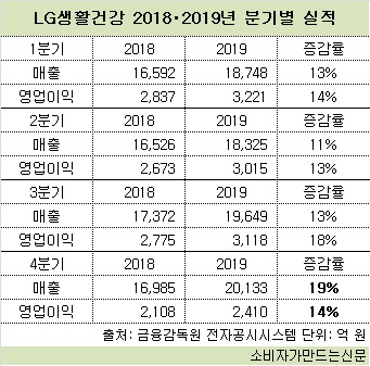 LG생활건강의 지난해 매출은 전년 대비 13.9% 증가한 7조6854억 원, 영업이익은 13.2% 늘어난 1조1764억 원을 기록해 사상 최대 매출을 달성했다. 4분기로만 보아도 매출 2조133억 원, 영업이익 2410억 원으로 각각 19%. 14% 성장했다. 특히 중국 매출이 62% 성장해 면세 매출 성장 둔화를 상쇄했다고 평가됐다.
