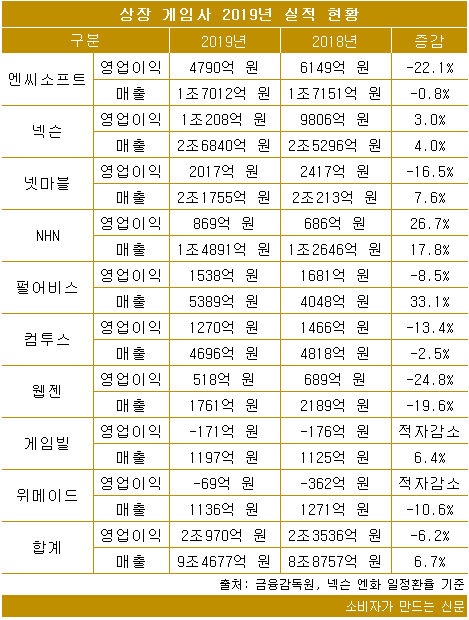 엔씨소프트와 컴투스, 웹젠, 위메이드 등 4개사는 매출이 감소했다.
