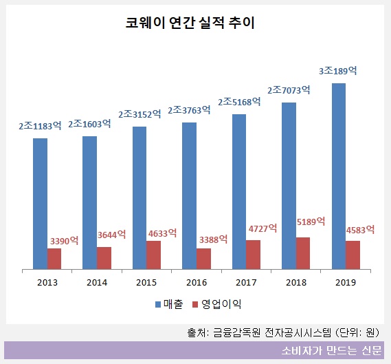 코웨이는 지난 2013년 매출액 2조 원을 처음 돌파한 이후 해마다 매출을 늘리며 6년 만에 3조 원을 넘었다.