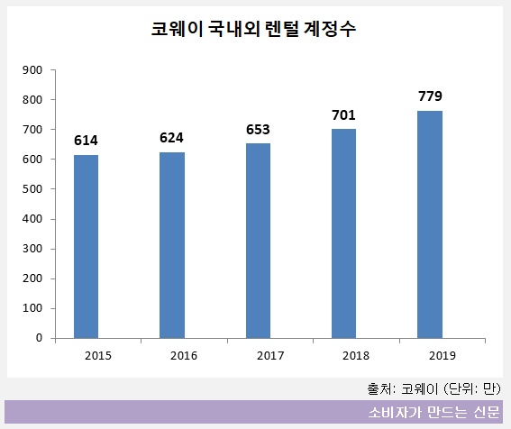 지난해 코웨이 국내외 렌털 계정은 779만 개로, 2015년 614만 개에서 26.87% 증가한 수치다. 국내 렌털 업체들이 200만 계정수를 놓고 2위 각축전을 벌이는 것과 비교하면 압도적 1위인 셈이다.