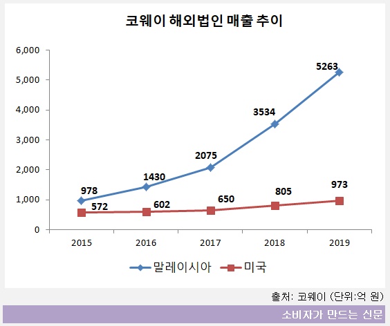 해외법인의 성장도 두드러졌다. 2007년 해외 사업을 시작한 코웨이는 현재 50여개 국에 공기청정기와 정수기를 수출한다. 특히 주 무대로 꼽히는 말레이시아 법인 매출은 2015년 978억 원에서 2019년 5263억 원으로 438.14% 급증했다.