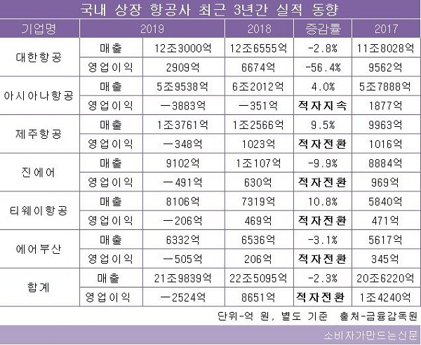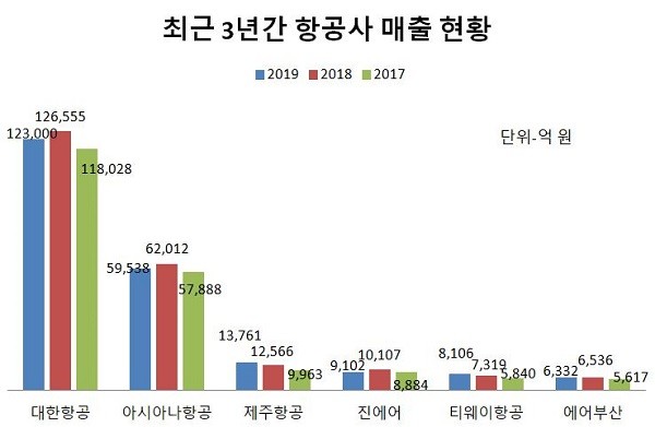 대한항공(대표 조원태)과 진에어(대표 최정호), 에어부산(대표 한태근)은 매출마저 감소하는 부진을 보였다.