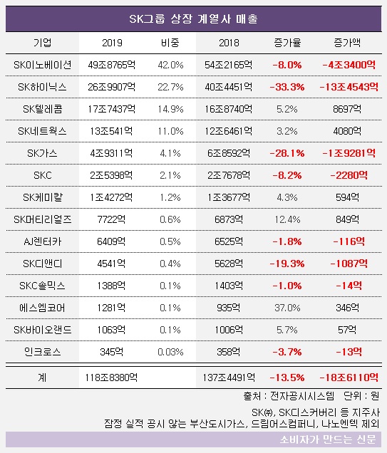 SK그룹 상장사들의 매출 감소액에서는 SK하이닉스(13조4500억 원)와 SK이노베이션(4조3400억 원) 두 곳이 차지하는 비중이 95.6%에 달한다.